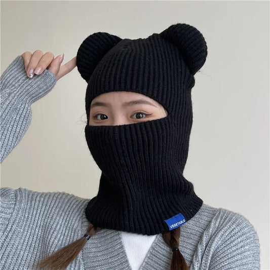 New Warm Winter Women Hat Cute Bear Ears Balaclava Scarf Female Outdoor Bikes Sports Knitted Wool Full Face Ski Mask Beanie Cap